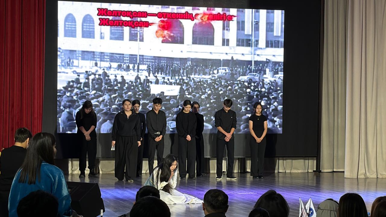 Сонымен қатар 16 желтоқсан оқиғасына байланысты арнайы қойылым көрсетіліп, сол кезеңдегі жастардың қайсарлығы, батылдығы мен ел үшін жанын пида етуге дайын рухы сахналық көрініс арқылы көрермендерге терең жеткізілді. Бұл көрініс залдағы көрермендерді бейжай қалдырмай, көпшіліктің жүрегіне әсер етті.